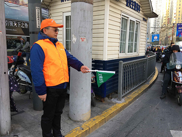 每天清晨7:25——8:35,上音安师的教工志愿者们身穿橙黄色的志愿者背心,头戴橙黄色的志愿者帽子,手拿文明出行的小旗准时地站在了武宁路长寿路四个交通路口,配合着路口的交警和交通协管员,共同维护路口骑车和行人的安全文明行路,保障着路口的畅通。无论寒流、还是大风、或是下雨,志愿者们依然以饱满的服务激情投入工作,没有迟到、没有早退、更没有缺席,站在路口认真地工作着,耐心地劝导着,仔细地解答和指点行人的问路,对听取劝告的行人报以真诚的微笑和感谢。